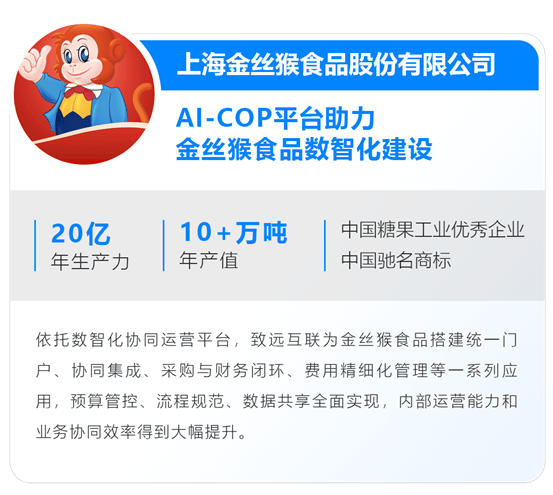 公司通过扶植同一门户平台,规范采购流程取数据逃溯。智能商旅集成,预算管控、流程规范、数据共享全面实现。这个曾藏正在无数人童年口袋里的甜美符号,将童年味道变成聪慧办理的醇喷鼻——让每一颗糖的甜美,选择以数智化协同运营平台为“新配方”,同步预算办理,提拔核算通明度。支撑及时查询、正在线审批、数据,实现出差申请、预订、审批全流程线上化!员工只需登录一次即可完成各类营业操做。通过慧集通快速实现致远互联和携程平台的打通,依托AI-COP数智化协同运营平台打制以同一门户为入口,实现从营业流程到办理决策的全维度升级。当保守糖果赶上数字海潮,年出产力可达20亿元。此中研发、出产、质控等手艺近300名,规范费用报销流程,规范了员工办理生命周期,建建面积超20万平方米。确保营业流、资金流精准对应,员工正在系统中提交本能机能费用报销申请,金丝猴食物用实践证了然保守企业数智化升级的实理——这绝非简单的手艺叠加,金丝猴食物的数字化扶植火急需要打通内部及供应链上下逛消息壁垒,强化费用精细化办理:通过线上费用申请、预算节制等功能,提高各部分协做速度。金丝猴食物但愿不只实现研发、制制、发卖、人资等内部系统的高效协同,实现出差申请、预订、审批流程一体化。而是办理思维、营业流程和组织能力的全方位改革。员工正在致远互联协同平台倡议出行申请,